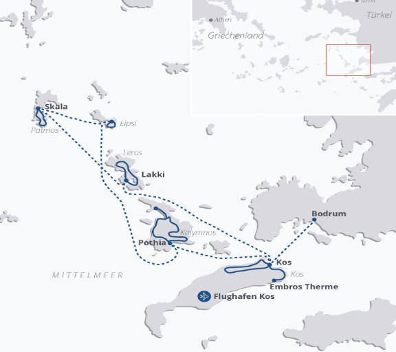 Mit einer komfortablen türkischen Gulet und per E-Bike erkunden Sie die Sonneninseln der griechischen Ägäis. Die Inseln sind eine magische und mythische Welt, reich an Geschichtszeugnissen und Geschichten. Gehen Sie mit uns auf Entdeckungsreise und erleben Sie die griechische Ägäis aus einer ganz besonderen Perspektive, nämlich zu Wasser und zu Land. Erholen Sie sich in idyllischen Badebuchten, genießen Sie die herrlichen Ausblicke und wandeln Sie auf den Spuren einer bewegten und ruhmreichen Vergangenheit. Lassen Sie sich in das faszinierende Asklepion auf Kos entführen, in welchem der berühmte antike Arzt Hippokrates die Medizinkunst erlernte. Genießen Sie die Ruhe und Beschaulichkeit der liebenswerten Insel Lipsi, tauchen Sie ein in die Atmosphäre der heiligen Insel Patmos und bewundern Sie die einzigartigen Panoramen, die sich Ihnen auf Ihren Radtouren bieten.