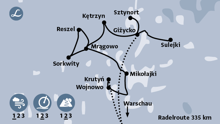 Die im Norden Polens gelegenen Masuren sind eine der landschaftlich schönsten, ursprünglichsten und grünsten Regionen Europas. Traumhafte Seen, weite Wälder und die Herzlichkeit der Einheimischen machen Masuren zu einem einzigartigen Reiseziel für eine Radreise Masuren. Mehrere 100 Kilometer Radweg durchziehen die bunte Landschaft. Wo früher noch Sand- und Waldwege vorherrschten, ist heute das Radeln ein besonderes Vergnügen. Wir tauchen ein in die Geschichte entlang hervorragender Wege in malerischer Umgebung. Nicht umsonst heißt es, dass man in Masuren sehen kann, wie es in Europa vor mehreren 100 Jahren ausgesehen hat, bevor die Besiedelung der Großstädte begann. Auf geht es auf eine Radreise durch die Zeit!