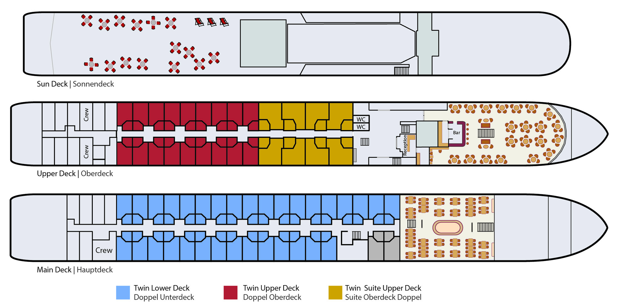 | 2-Bett-Kabine auf dem Unterdeck (= Hauptdeck) | 799.- € | 949.- € | 1099.- € | 1259.- € | 1369.- € |