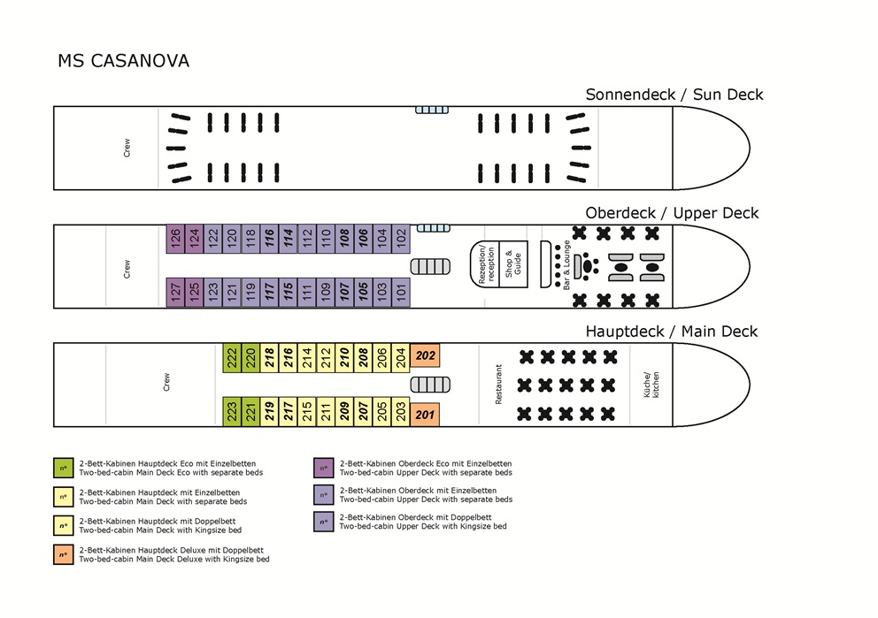 Die MS Casanova verfügt über 48 Außenkabinen auf zwei Decks – jeweils ca. 12 m² groß und ausgestattet mit Dusche/WC, Föhn, Sat-TV, Safe (gegen Kaution), Minibar, Bordtelefon sowie individuell regulierbarer Klimaanlage. In den Eco-Kabinen kann es zu wahrnehmbaren Motor- und Generatorengeräuschen kommen. Kabinen mit Einzelbetten verfügen über zwei getrennte Betten, von denen eines tagsüber als Sofa genutzt werden kann. Die Kabinen mit Doppelbett sind mit einem großen Bett (1,60 × 2 m) mit zwei einzelnen Matratzen ausgestattet.